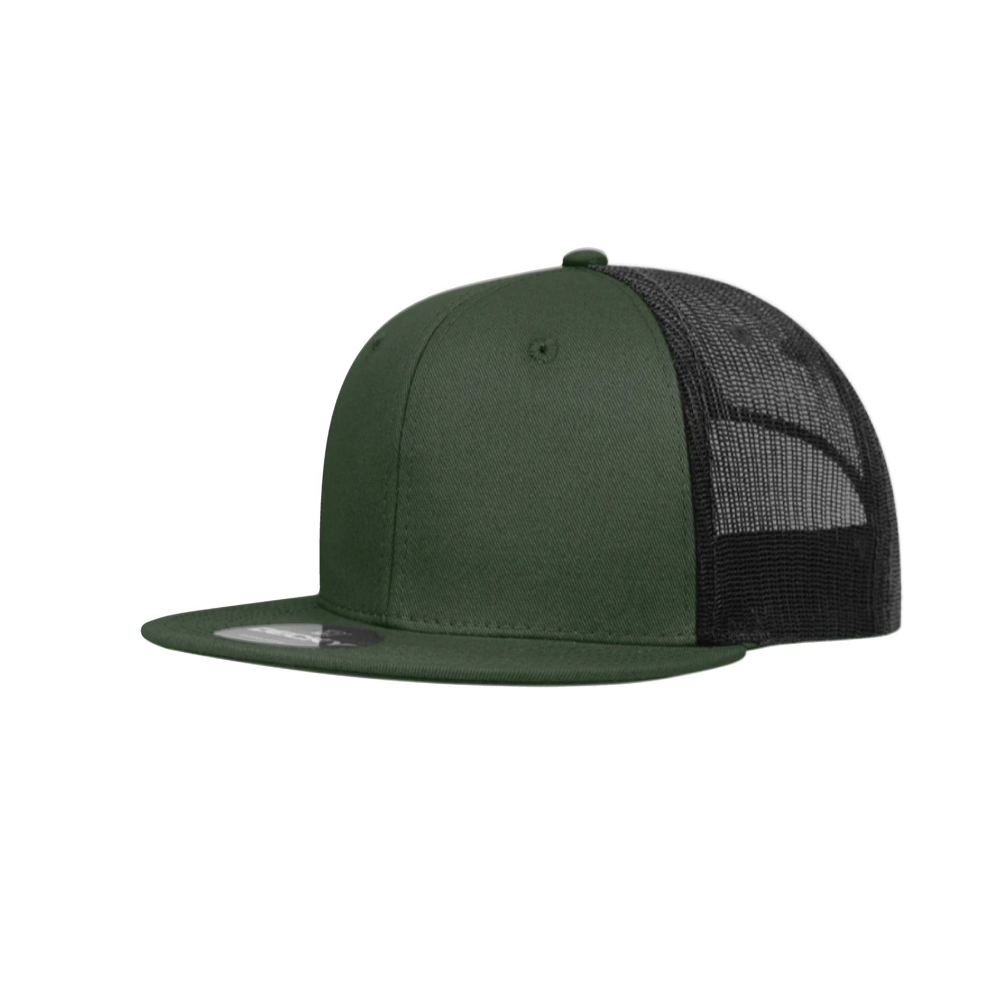 The 6-Panel Flat Bill Trucker Hat is a structured, 6-panel hat with insulated rear mesh panels. It has a retro flat bill, a vintage plastic snap closure and an integrated cotton sweatband.