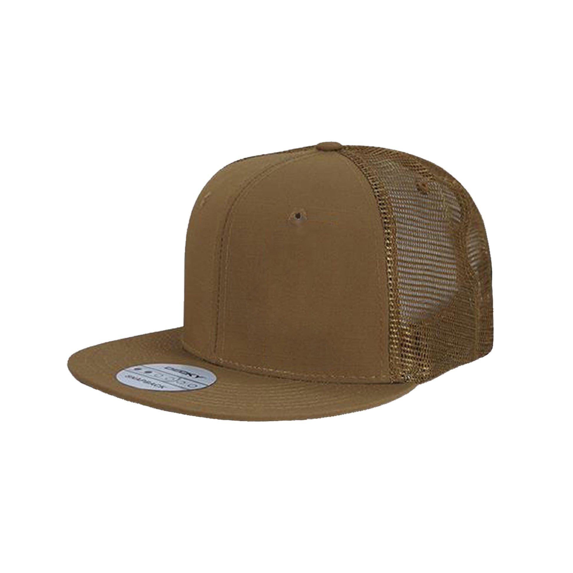 The Flat Bill Trucker Cap, 6 Panel Trucker Hat, with a special reinforcing technique making it resistant to tearing and ripping. It has rear mesh panels, an integrated cotton sweatband, 8 rows of stitching across a flat bill and is finished with a classic plastic snap closure.